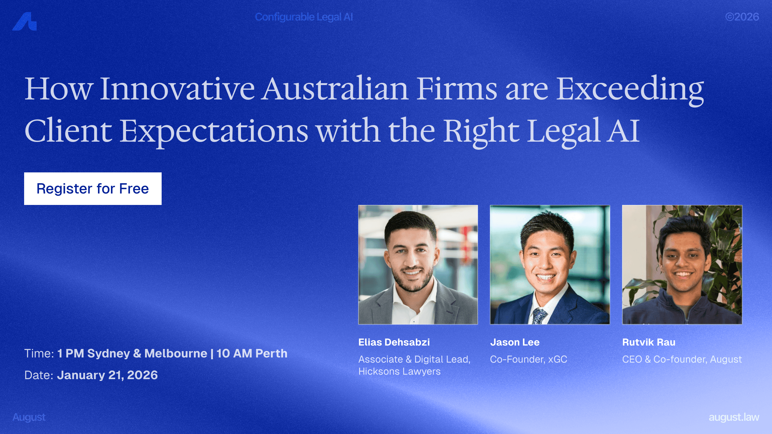 Join Elias Dehsabzi (Associate and Digital Lead, Hicksons Lawyers), Jason Lee (Co-Founder, xGC), and Rutvik Rau (CEO, August) for an honest discussion about legal AI adoption in Australian firms.
