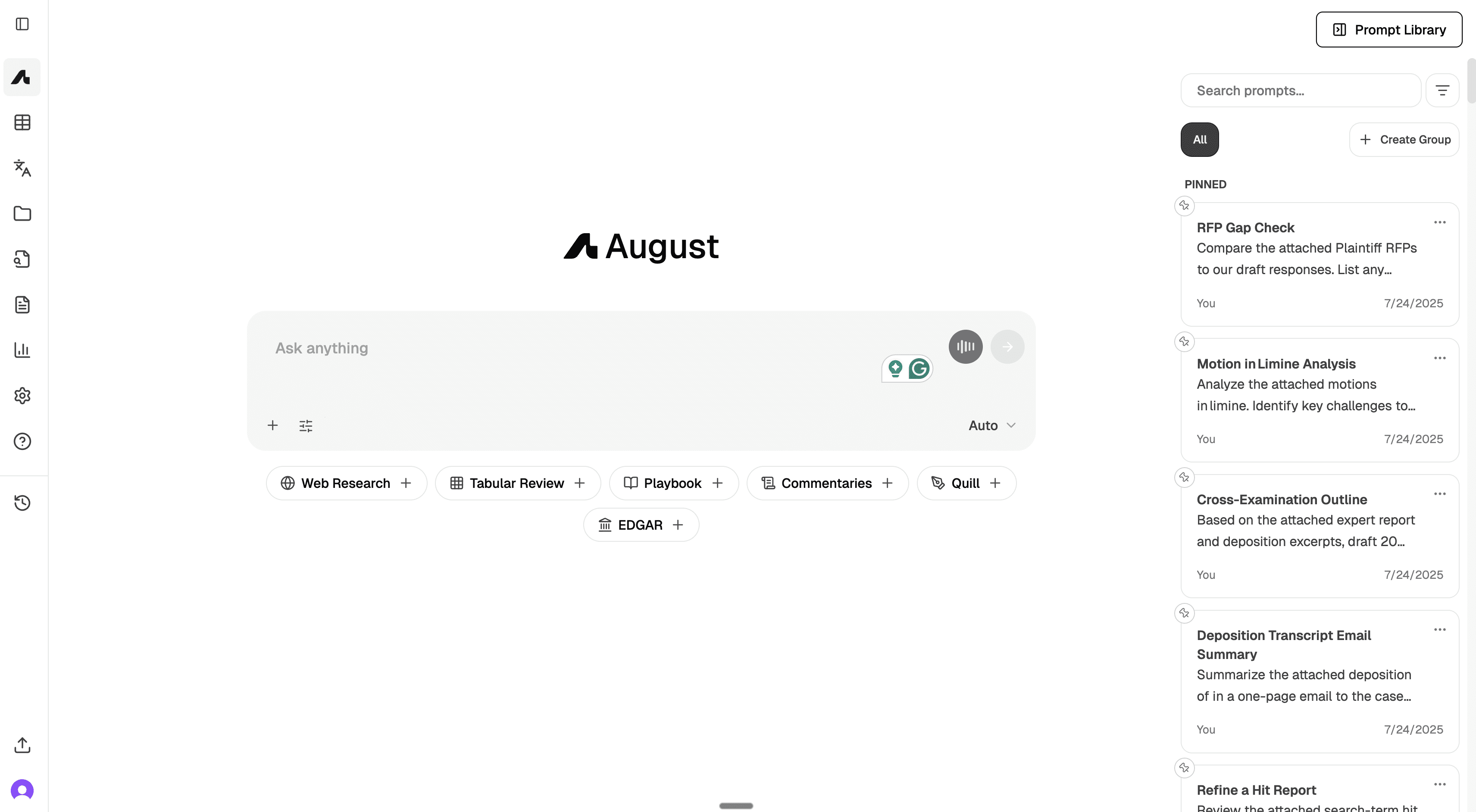 Our Assistant interface needed to match the sophistication of what it can do. We simplified the layout for clarity, moved the prompt library to the top right for easier access, and added voice mode so you can speak to August like a true Associate.
