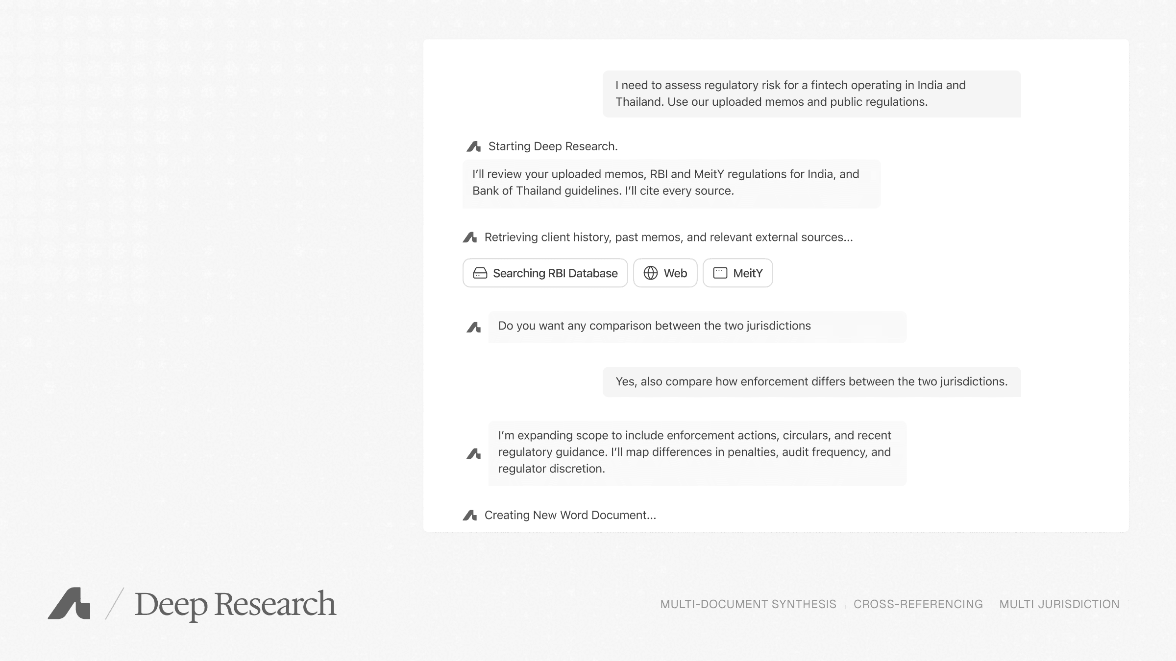 How it works: instead of running a single search, Deep Research iteratively identifies relevant documents, refines its approach, and expands coverage to ensure completeness. It can review internal content, integrated repositories, regulatory sources, and uploaded documents. All findings include citations to the original source material.