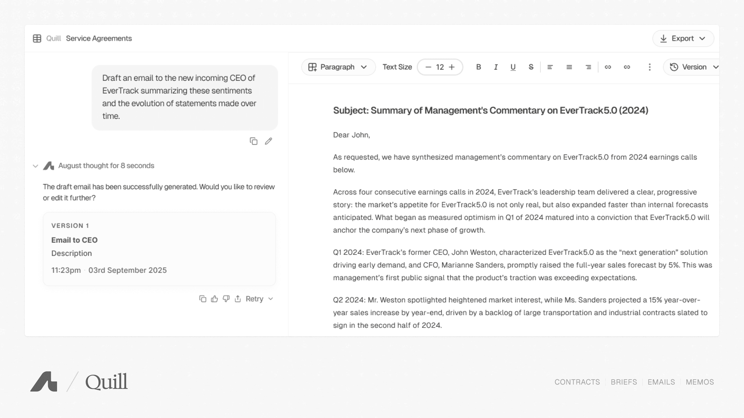 Quill is August's drafting wizard. You can create contracts, briefs, emails, and memos directly in the platform, with August available inside the editor to generate or revise language as you work.