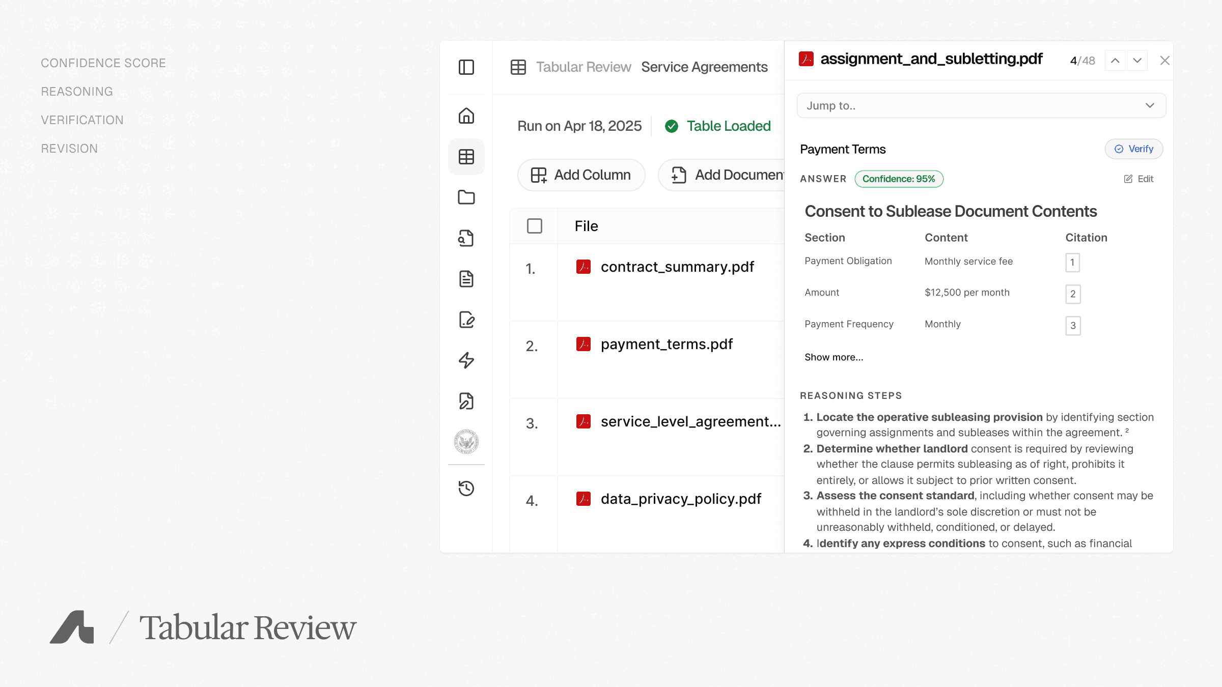 When you're reviewing dozens of contracts, you need structured output. Tabular Review extracts information across documents and presents it in a sortable, filterable grid.