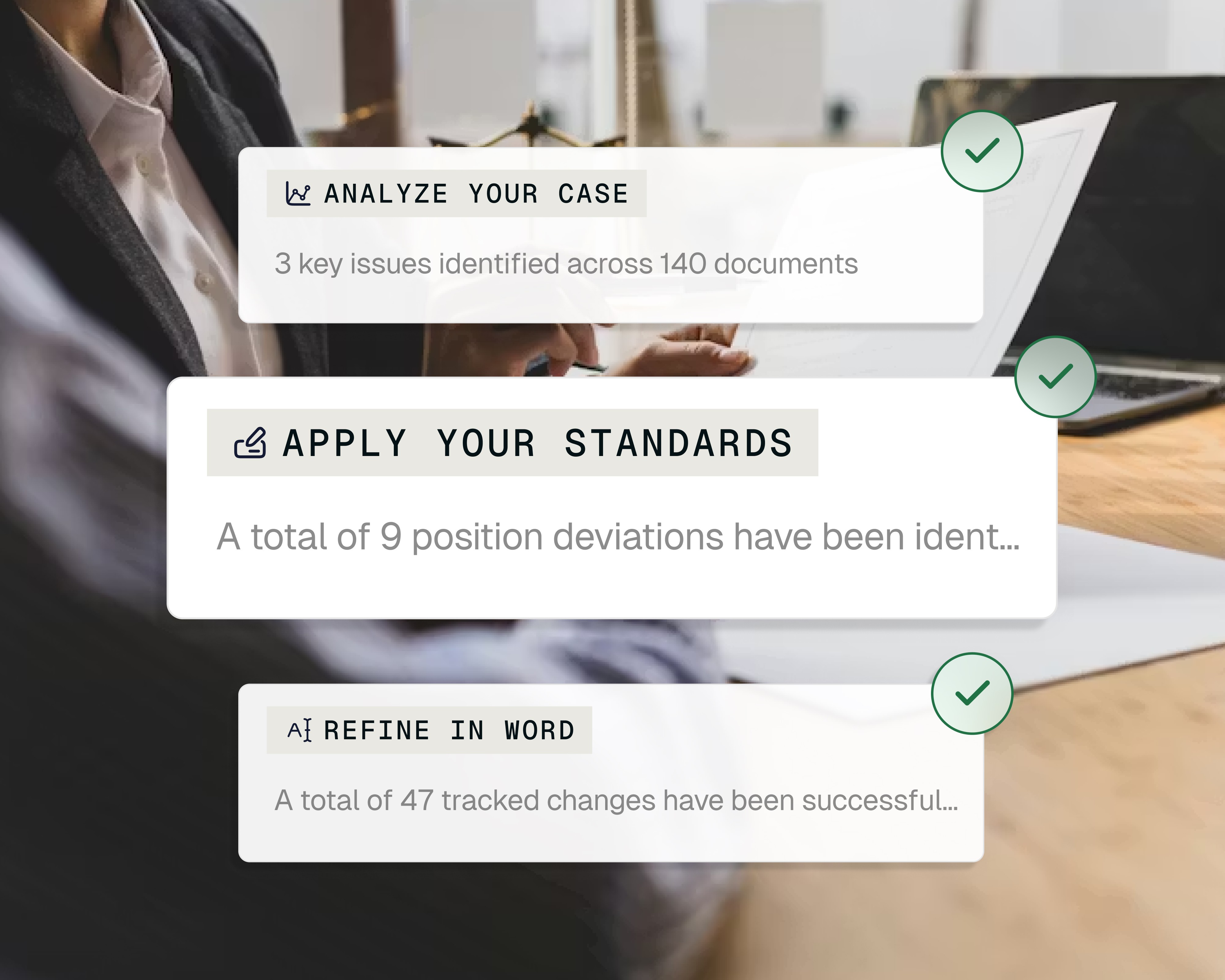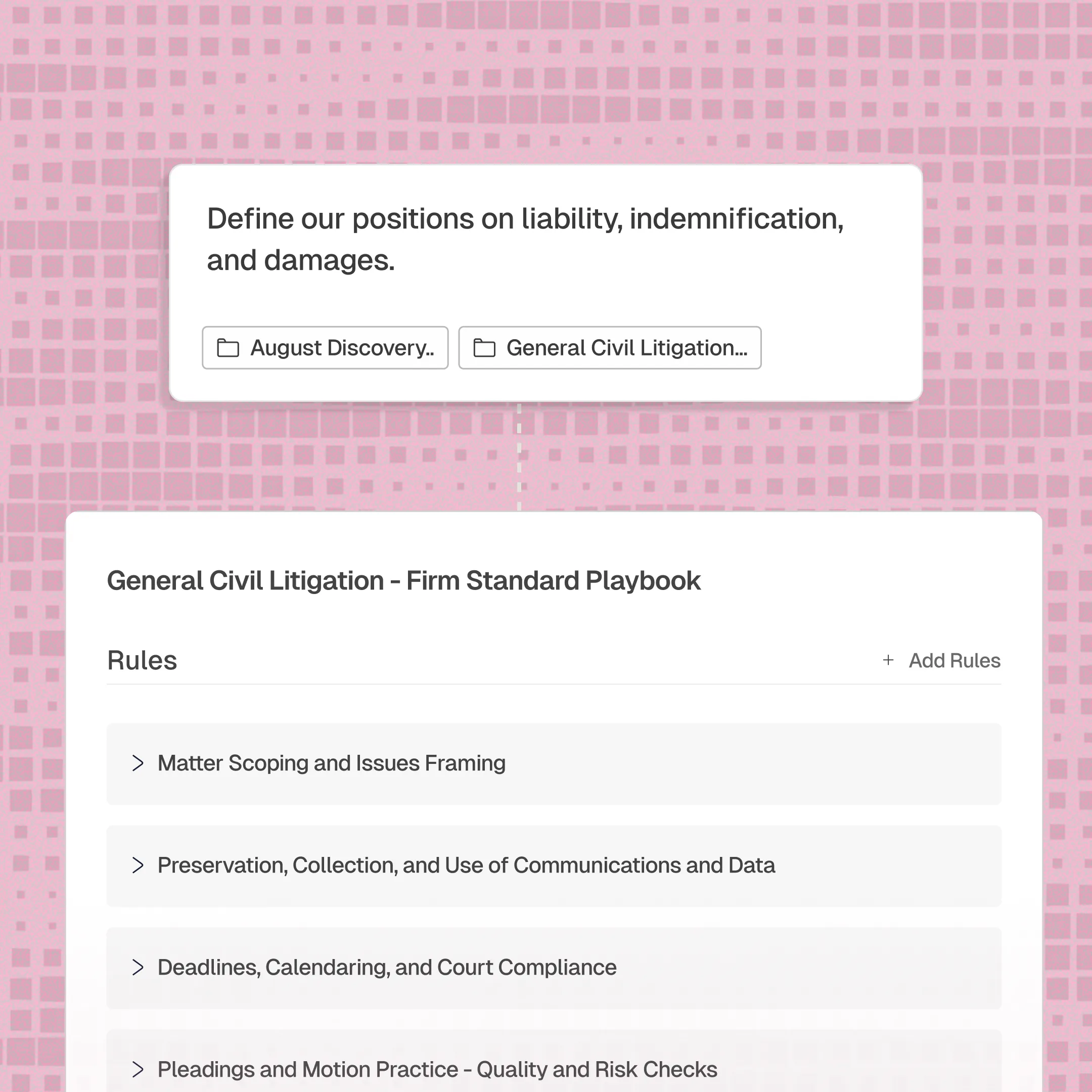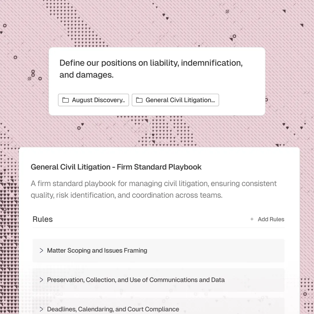 Every firm has positions it takes on key issues, but applying them consistently across a full case takes hours of manual review. August lets you codify preferred language, fallbacks, and rejection criteria into Playbooks that run automatically. You catch every deviation without reading every page.