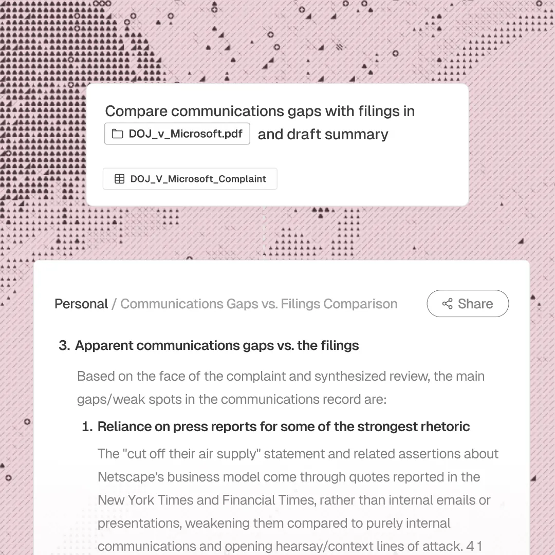 Early case work means reading hundreds of documents before you know what matters. August lets you upload complaints, transcripts, correspondence, and discovery, then ask questions across the entire set. You get case assessments, chronologies, and issue-spotting in minutes.
