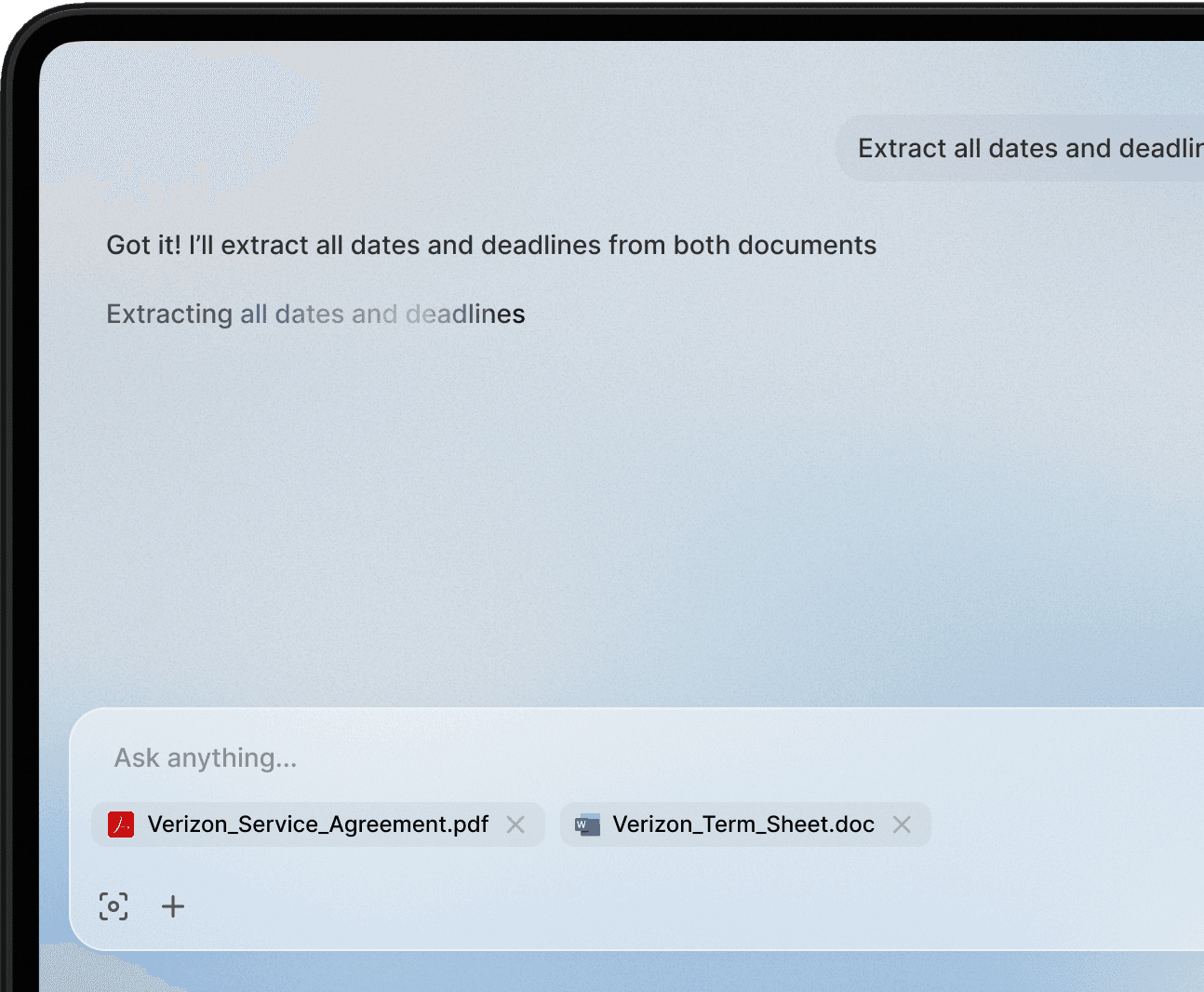 Ask questions, upload documents, generate drafts, and run legal analyses — all from one conversational AI interface built for lawyers.