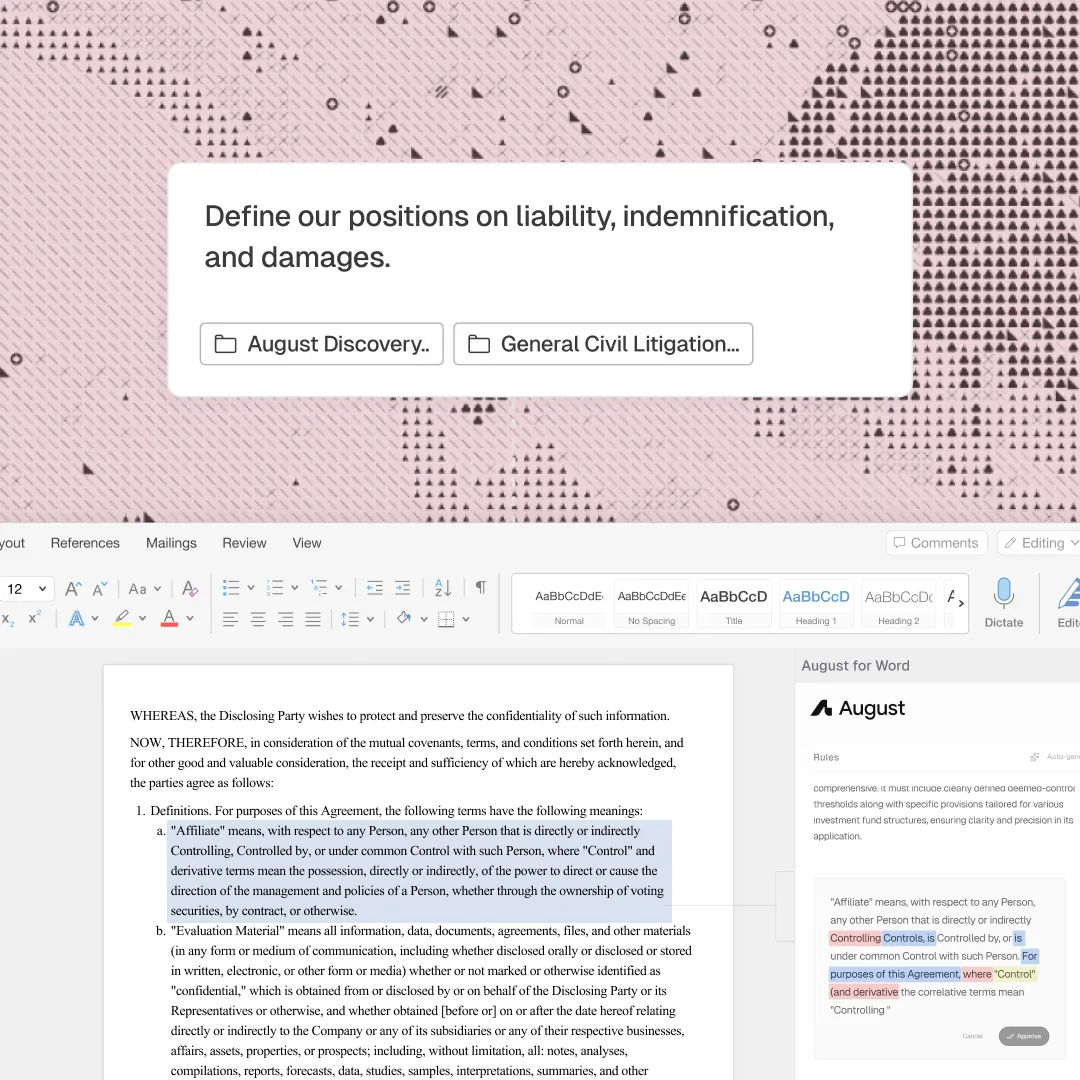 August reviews your documents, applies your firm's standards, and drafts your redlines, so your team can focus on the work that moves the case forward.